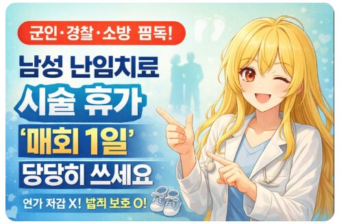 최근 저출산 대책의 일환으로 공공부문의 모성보호 및 일·가정 양립 지원 제도가 대폭 강화되었다. 하지만 여전히 많은 남성 군인, 경찰, 소방관, 공무원분들이 “남자인 나도 난임 휴가를 쓸 수 있을까?”, “시술 때마다 눈치 보지 않고 갈 수 있을까?” 고민하곤 한다.